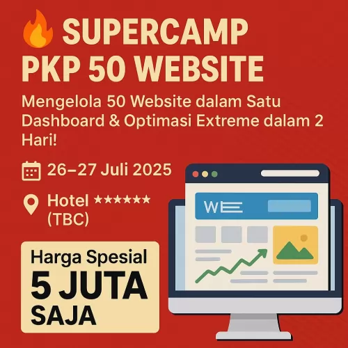 Stop membuang waktu dan uang! Hadir untuk Anda, SUPERCAMP PKP 50 WEB, sebuah program intensif yang dirancang khusus untuk Anda yang SERIUS ingin membanjiri orderan dari Google dan jadi Raja SEO Digital! Ini bukan sekadar jasa pembuatan website biasa; ini adalah investasi untuk menciptakan ekosistem digital yang powerful bagi bisnis Anda.